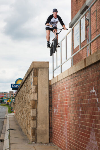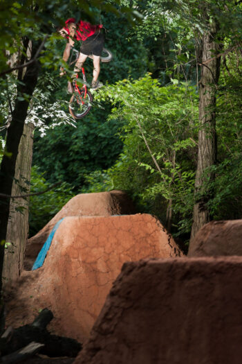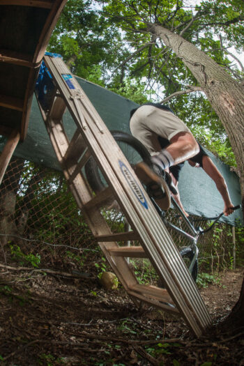 Pete Sawyer is one of the more creative guys I’ve had the pleasure of shooting with, and he has an eye for photogenic setups. He didn’t ride the jumps at the trails, put chose to take the quick way down this ladder off of the roll-in instead.